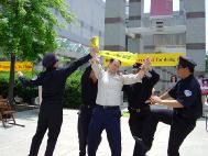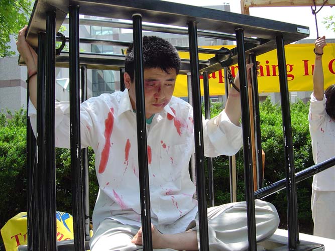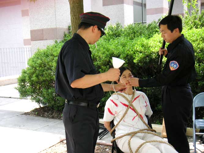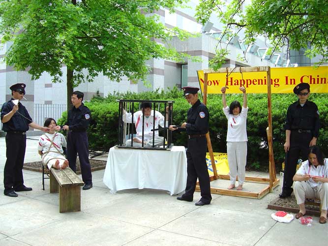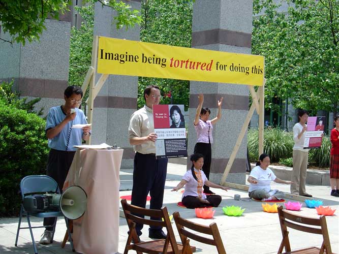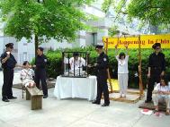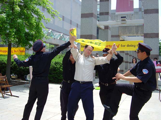 【明慧网2004年5月23日】为支持2004年5月27日在芝加哥起诉邪恶之首的行动,北卡罗莱纳州的法轮功学员于5月20日在洛丽(Raleigh)市中心筹备了一场揭露江氏集团残酷迫害法轮功学员的表演,呼吁人们的关注。