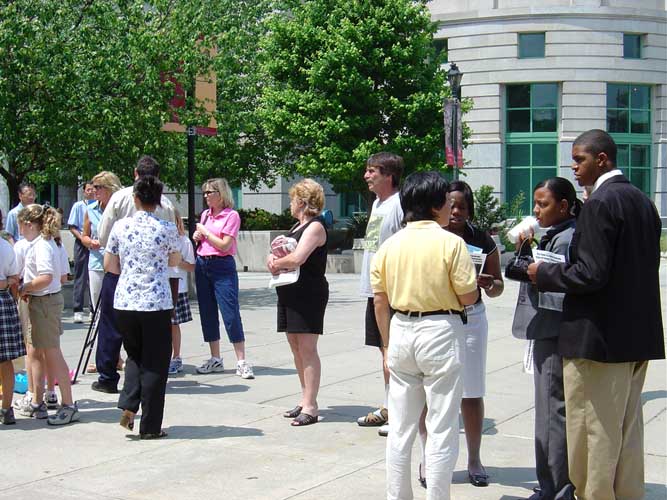 当天路过的行人众多,特别是参观附近博物馆的学生。当人们看到迫害纪实部分的表演后,都感到震惊。一位路人说:“我知道,那里没有人权”,另一位观众告诉学员他经常来往美国和中国,很想了解法轮功是什么,并留下名片嘱咐学员两个月后一定打电话给他。还有一位路人一直注目观看,直到活动结束。