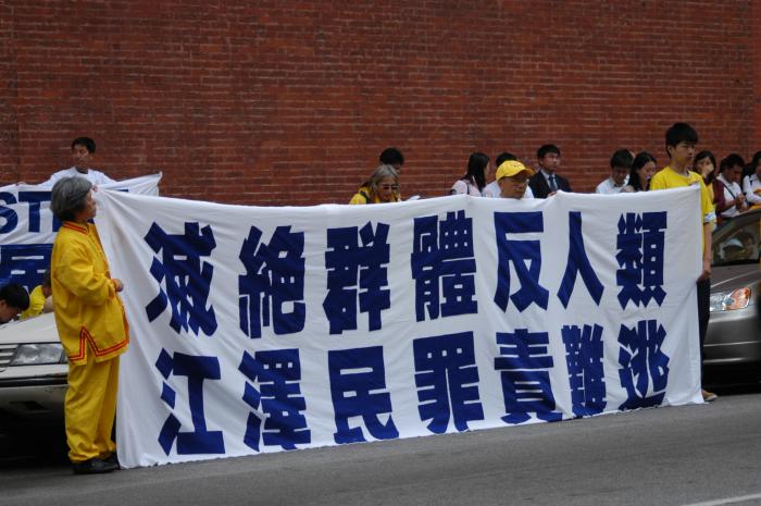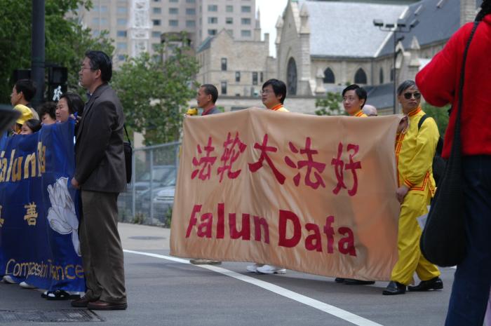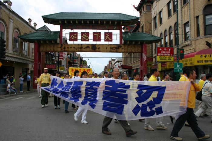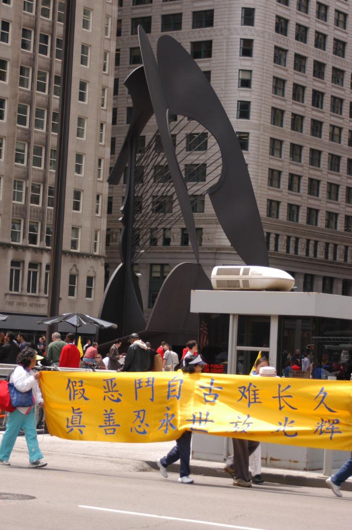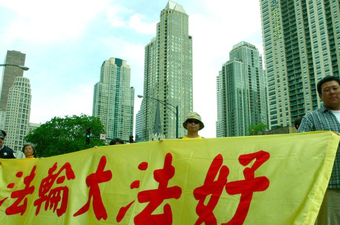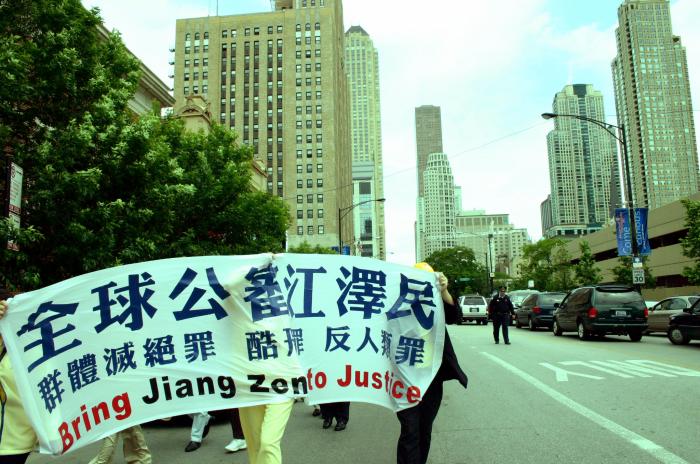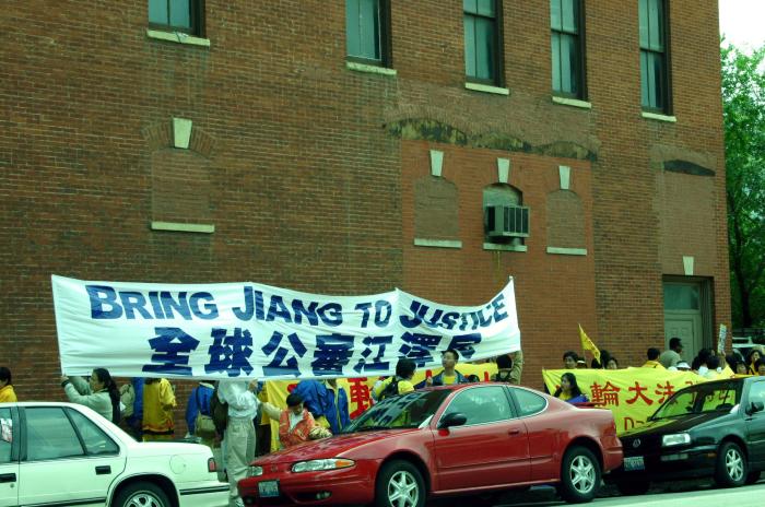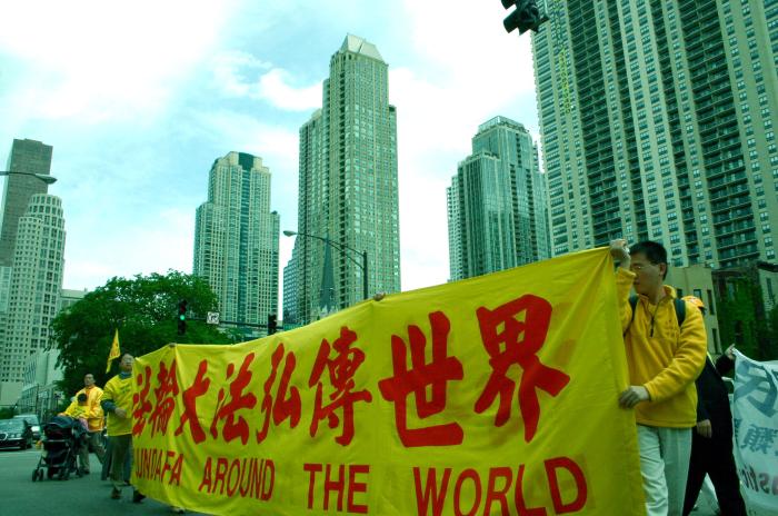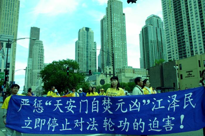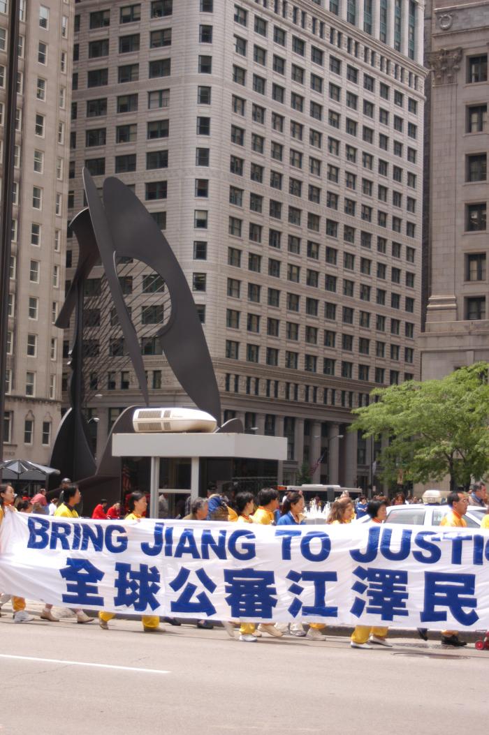 新闻发布会之后,2000余名法轮功学员在芝加哥市中心举行游行,呼吁停止迫害,揭露江氏对法轮功学员的酷刑罪名。游行队伍最后到达中国驻芝加哥总领事馆门前。