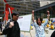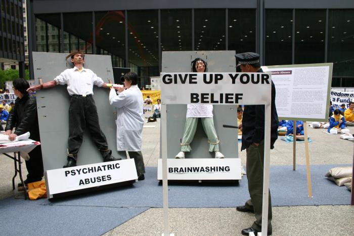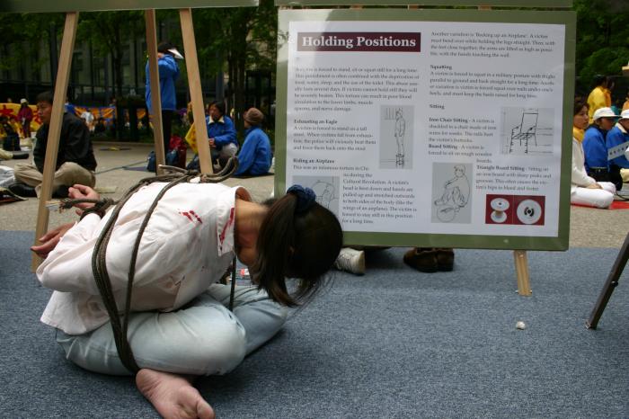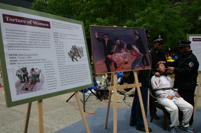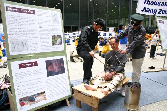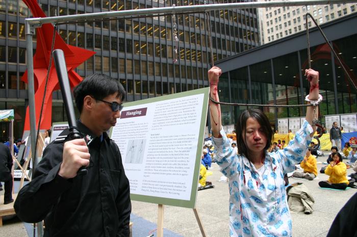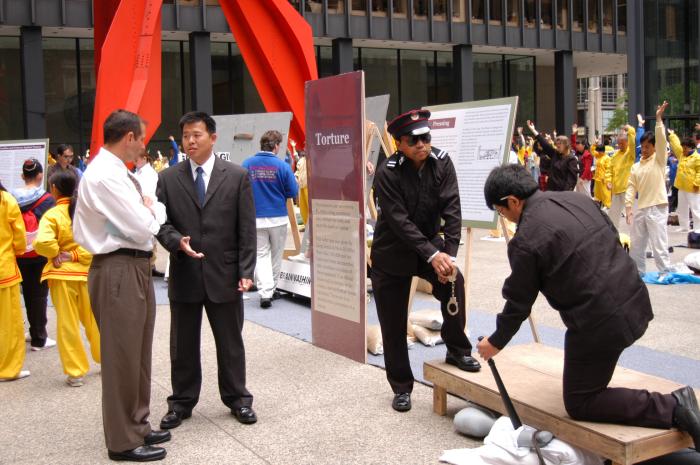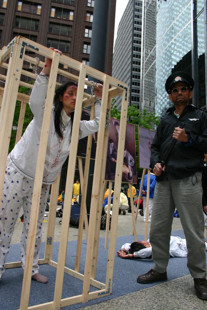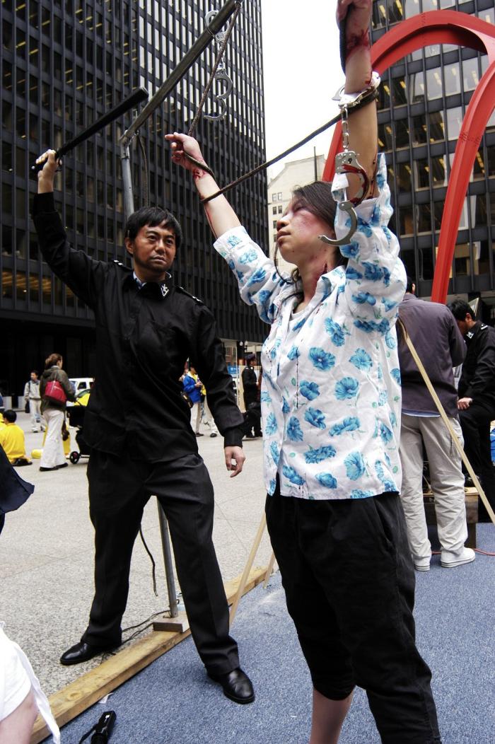 5月24日,在芝加哥市中心联邦广场的“迫害与信仰”真人演示及图片酷刑展,将令人难以置信的那一幕惨烈又展现出来。酷刑展的组织者,芝加哥大学生命科学博士后,法轮功学员刘先生说:“我们的这次活动主要是配合5月27日在第七巡回法庭上就法轮功学员控告前中国国家主席江泽民酷刑、群体灭绝和反人类的罪名進行法庭辩论。希望用这种真人实物的形式形象生动的表达江氏集团用非人的办法折磨法轮功成员,其中包括妇女,老人,儿童和孕妇,希望人们在看到这些展览和真象后,能够站在正义的一边。”