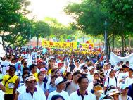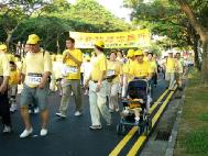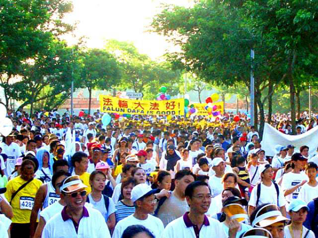 7点30分,当主持人宣布“好玩走”开始时,迫不及待的人群有如决堤的洪水冲出了起点。当一队身着黄色T恤衫,高举黄底红字巨大横幅的整齐人群出现在人们的视线时,每个看到的人都为之一震,主持人大老远一眼就认出了是法轮功的队伍,用英文大声地打招呼“Welcome FaLun Gong!”(欢迎法轮功!),接着又用华文说:“法轮功,你好吗?”,“好!谢谢!”接着就是雷鸣般的掌声,队伍里的法轮功学员和主持人互相挥手致意。