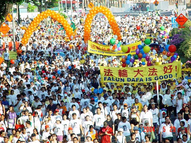 当5.6公里的竞走接近终点,骄阳下累得筋疲力尽的人群早已溃不成军时,由从小到只有17个月大的婴儿,至大到73岁的老奶奶组成的法轮功方队,依旧步伐整齐,横幅挺挺高高地走过终点时,在人们惊奇的目光中结束了“2004年的新加坡大竞走”。整个过程始终伴随着笑声和歌声,那么得坦荡祥和。