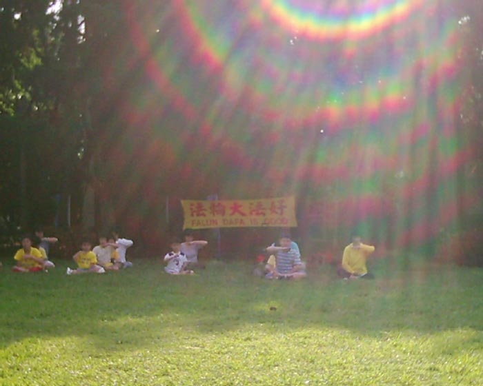 这样祥和的场景不禁让人想到在海峡的对岸,法轮功学员却处处受到栽赃打压。江氏集团在全国发起百万签名运动,以形成一种全社会反法轮功的压力,连小学生都不放过。小小的小学生,不签名就当不了班级干部,甚至被迫退学。公安随时随地任意闯進法轮功学员家抄家、罚款、严密监视等等。所有法轮功学员的人身自由每时每刻都在受着威胁、随时有被非法无故抓走的可能。透过台湾法轮功学员和小弟子们的炼功洪法和发真象资料中,也期待大陆的人权和信仰的自由能受到更多朋友的关注,期许这场不人道的迫害早日结束,让更多人都能喜得这样好,这样纯正的法轮大法!