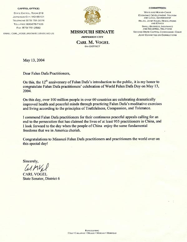 沃格尔参议员说,在法轮大法传世12周年之际,我荣幸的祝贺法轮大法学员在2004年5月13日庆祝世界法轮大法日。在这一天,60个国家的一亿多人在欢庆他们通过修炼法轮大法的功法和实践真善忍原则,他们的健康得到明显改善,心灵更加宁静。