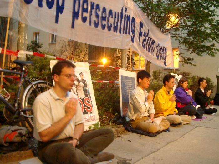 支持芝城审江,柏林学员中国大使馆前集体发正念(图)