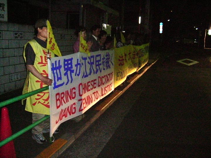 【明慧网2004年5月28日】5月27日,为支持在芝加哥的美国联邦法院第七巡回法庭上诉庭就诉江案進行的法庭辩论,日本部分大法弟子聚集在东京的中国大使馆前请愿,黄底和白底的横幅上打出“全球公审江泽民”“法轮大法好”“江泽民因群体灭绝罪在海外被起诉”等横幅,向世人昭示江氏集团的累累罪行并讲清真象。