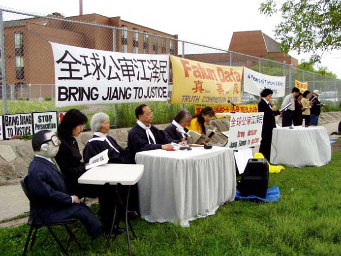 在利用司法程序起诉迫害元凶的同时,从加拿大国会山到安大略省政府,从多伦多市政府前到十几个大学校园里,甚至在加拿大的街头巷尾,人们都可以在模拟审江的法庭上,看到对江氏集团迫害法轮功,群体灭绝罪的审判。