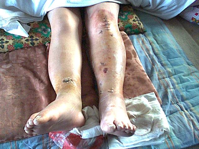 2004年4月10日,由于恶人跟踪,我在住处被36名恶警围困,在德惠市公安局恶警疯狂砸门欲破门而入的情况下,为了免遭迫害,我被逼从5楼跳下,摔成重伤——腰部压缩性骨折,双腿粉碎性骨折。在这种情况下必须抬到硬板上及时送医院而不应该拖拽,以防神经受损,而在场的恶警不顾我的生命安危,两个人强行拖着我走,致使腿部骨折处的骨头扎進皮肤,而且腰部、腿部神经受损。在德惠市人民医院确诊我终生截瘫、生活不能自理的情况下,德惠市政保科又将我送往长春市劳改医院進行迫害,劳改医院所谓的医护人员将我双手铐上手铐,铐在床上强行输液。第18天在我身体极度虚弱、病情危重时,德惠市政保科怕承担责任,才决定将我接回。在接我之前,它们欺骗我父亲在保证书上签字,说等放我回家时给释放证,我老父亲信以为真签了字,而送我回家时带去的竟是取保候审单,而且政保科一直在隐瞒实情说我只是双腿骨折。当六、七十岁的父母见我腰部骨折,身体一点不能动时质问它们,它们却找借口搪塞。