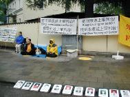2004年5月1日,部分德国南部地区的法轮功学员在德国慕尼黑中领馆前举行“把江××、罗干、刘京、周永康送上审判台”的活动。