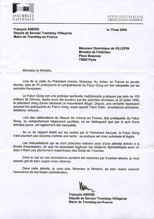 最近,法国国会共产党和共和党派议员、国会法中友好小组成员弗朗索瓦-阿桑希先生(Francois Asensi)致函内政部长表示,法国警察的行为构成对法轮功学员的表达自由的直接侵害。全文如下: