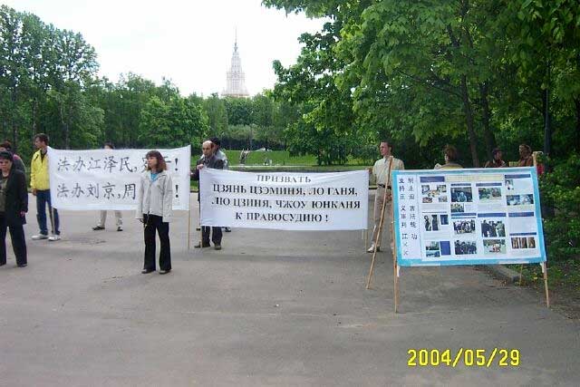 学员们在中使馆前的广场上展示了揭露江泽民邪恶集团在中国残酷迫害法轮功学员的真象展板并展开“全球公审江泽民”等中、俄文横幅。学员们集体炼功、发正念,向世人讲真象。
