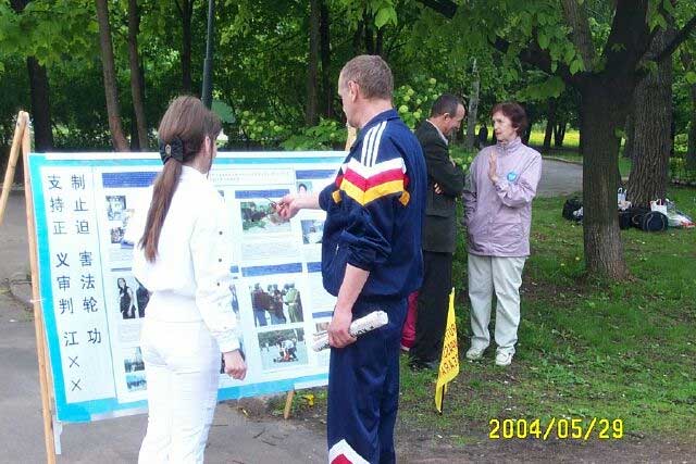 莫斯科一家电视台進行了现场采访。有很多的过路人驻足观看展板。一位住在使馆附近的退休老人,每次学员们在使馆前集会他都是远远的离开集会的地方。这次他从一开始就站在江氏集团迫害法轮功的展板前认真的看,还认真的听学员给他讲解,他讲:对这样好的人進行这样残酷的迫害,我无法理解。还有不少了解真象后的年轻人对在中国发生的迫害感到震惊,并表示:应该制止迫害。