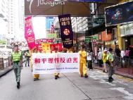 亚洲时报5月3日报导,七百多名香港及外国法轮功学员,2日在香港闹市游行,要求中共释放被拘留的大陆法轮功学员,并抗议港府拒绝让廿名台湾和五名澳门学员入境出席年会。