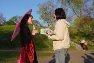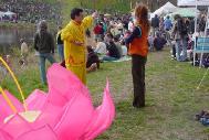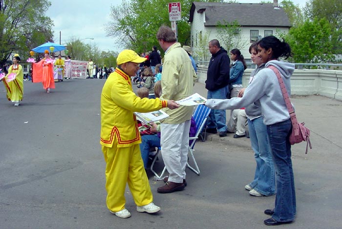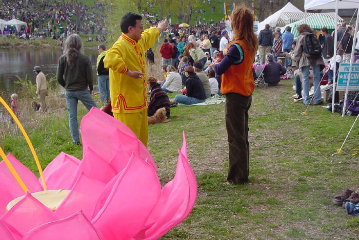 很多观众在经过展位时都向法轮功学员微笑,并称赞他们今天的游行队伍。也有一些人索性停下来与学员交谈。一位会讲中文的白人小伙子,开心的和学员用中文交谈,并希望能带他的弟弟一起来炼功点学功。也有家长带着孩子在展位驻留,一位家长说她女儿特别喜欢法轮功学员的游行,尤其是那朵大莲花,真是漂亮,她还带女儿特地走到湖边观看那朵大莲花。到晚上七八点时游人虽减少,但却有很多人停下来和法轮功学员交谈,有的人甚至来了不止一次,很想多了解一些情况。