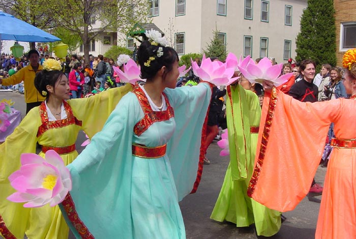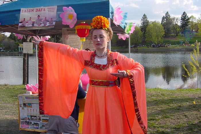 ![]() 法轮功学员的游行队伍 | ![]() 观众很高兴拿到法轮功的真象资料 | ![]() 莲花舞 |