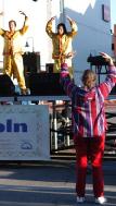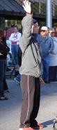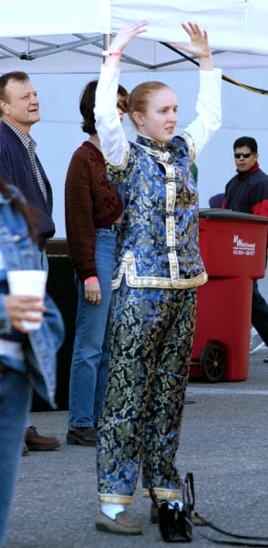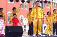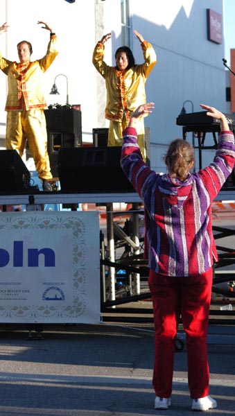 快到下午七点时,因为有人临时缺席,我们又得以上台展示功法。我知道我们的正念起了作用。在台上展示功法时,台下有很多人都跟着学了起来。