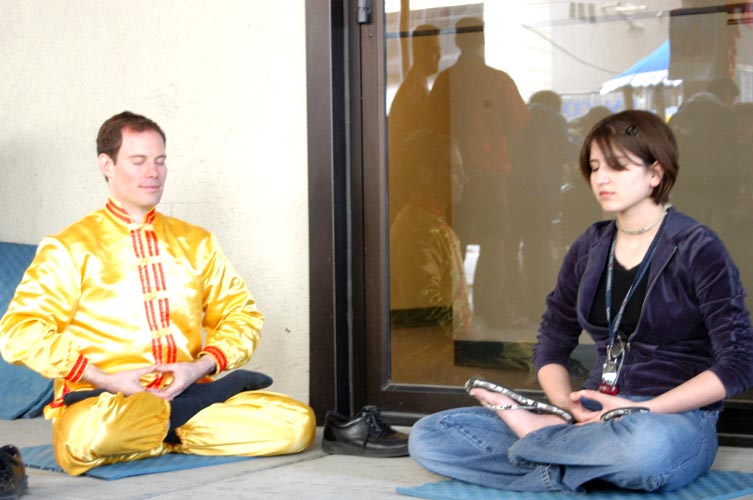 在整个活动期间至少有20人当场就和我们学了功,包括许多小孩。期中一个小女孩来了好多次,并单盘打坐半小时。一个小男孩兴奋的冲我喊着:“我妈妈说我星期日可以去学功!”
