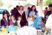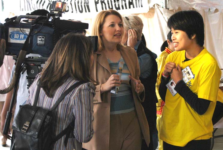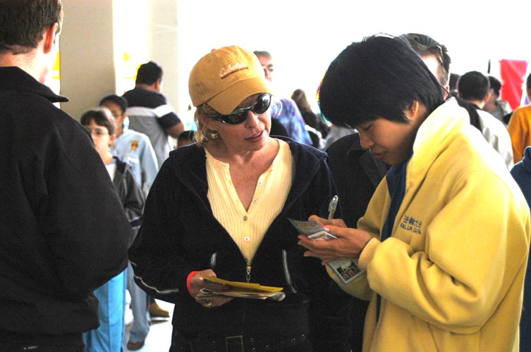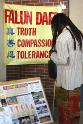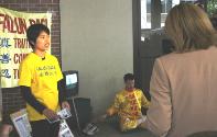 星期五当日(二零零四年四月三十日),多亏有许多邻近的法轮功学员来帮忙。我们在展位摆上两份法轮大法的“真善忍”布条,大法书籍,书签,真象资料,及大家精心制作的纸莲花。我们还自己制作了印有“停止在中国迫害法轮功”字样的卡片准备让人签名后寄去华盛顿特区中国大使馆。