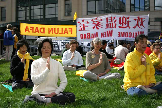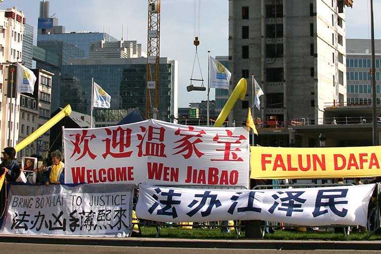 ![]() 法轮功学员们在布鲁塞尔打出的横幅 | ![]() 在德国柏林举行的中德高科技论坛会场外打出横幅 | ![]() 在温家宝一行下榻的Sheraton饭店前炼功,发正念 |