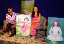 作为一名业余画家,夏琼芬提到她的绘画的能力是来自于天生的。在修炼法轮功之前,她的作画只是为了取悦大家而画。7年前开始修炼法轮功以后,作画风格有所改变,一种宁静,沉稳,愉悦的风貌,渐渐呈现在画布上。夏女士介绍道:“自从修炼法轮功以后,我认为自己从内心改变了。我开始感觉我的心变的非常纯净,安宁和舒服。我感觉要把它表达出来。特别是看人们炼功时。我能感觉到他们炼功时的平和舒适。当我开始画这副画时,(一位女孩伸展手臂炼功的画)我试着将那种感觉表现在这画面上,我真希望当人们看到这幅画时也能感到和平与舒适。”她随后说:“李洪志先生将这套功法传出已有12年了。5年前,中国政府规定禁止修炼法轮功。中国政府通过媒体制造谎言,当时有1亿多人修炼,很多修炼者遭到迫害。这是套性命双修的功法,刚才我所讲的是修身的部分,修心部分我们追寻的是宇宙真,善,忍特性来修。”
