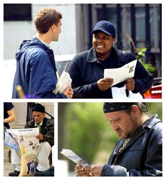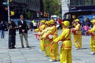 整个庆祝活动中,民众对法轮功表达了极大的关注和喜爱。资料供不应求,近2500份英文报纸送到了人们的手中,许多人驻留观看法轮功学员表演功法,聆听学员的发言,停下来和学员交谈,了解法轮功和中国发生的迫害,询问学习班的情况。一些人当场模仿学员的动作,有两位直接走進学员打坐的队伍中,和学员一起打坐。一位老者模仿第二套功法,当学员给他资料时,老者发自内心的喜悦,不停的真诚的说“谢谢”,并吹笛子和着“法轮大法好”的音乐。两位年轻的中国人观看了大部分的节目并拿了真象资料。