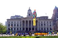 “法轮大法好”兰底金字,“真善忍”黄底红字,左右呼应,在阳光下分外的醒目。中英文“5.13 世界法轮大法日”的大竖幅在彩色大气球的牵引下在空中竖立,远远的就可看到。粉底兰字的中英文横幅“May 13 WORLD FALUN DAFA DAY 世界法轮大法日”在高高的阶梯上告诉着世人5月13日这个特殊的日子。