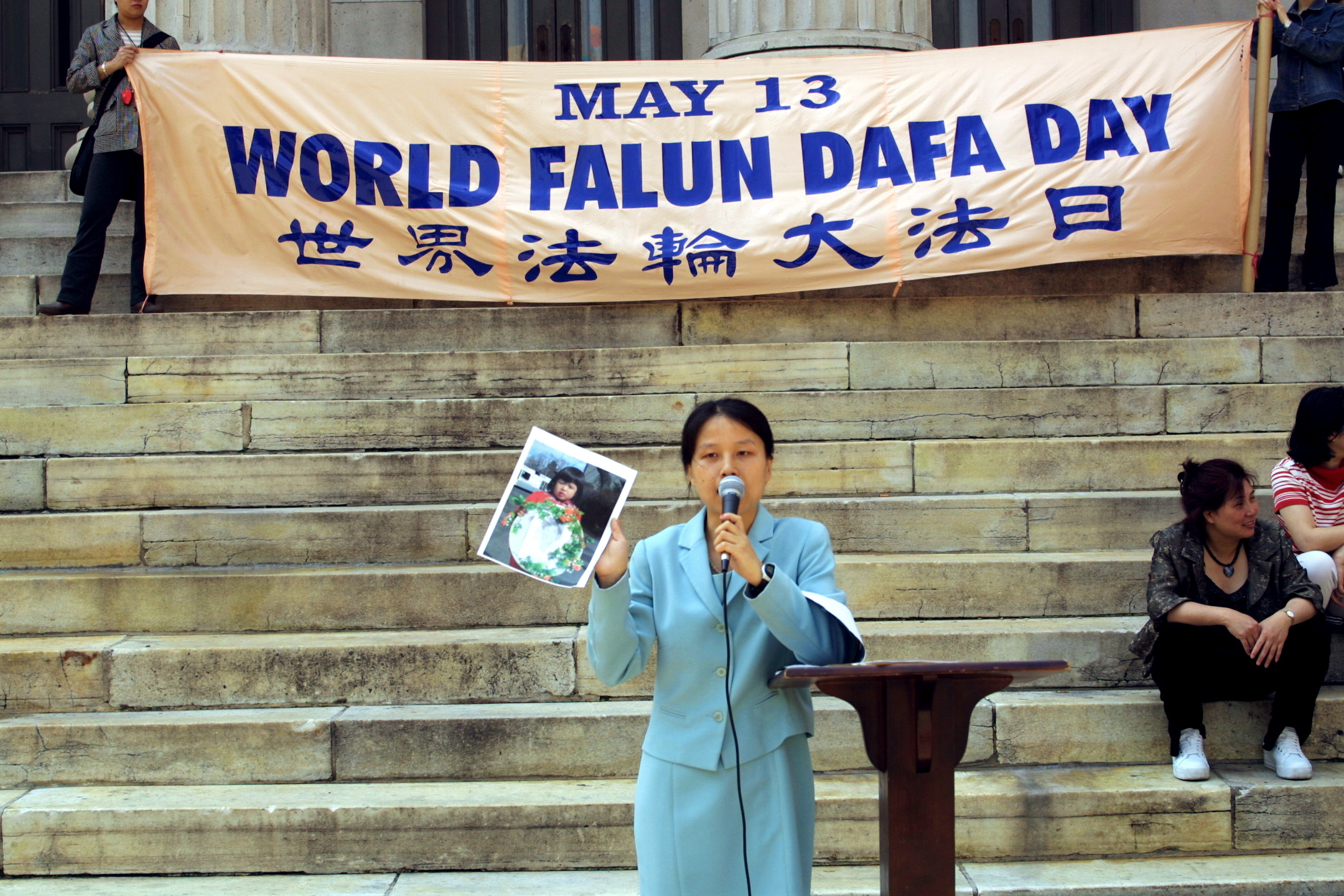 一位学员举着在这场迫害中失去了幼小生命,失却了父母的孩子的彩色照片讲述了孩子们所遭受的迫害。