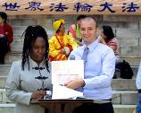 州参议员Velmanette Montgomery 在褒奖中写道:……法轮功修炼者在布碌伦庆祝第五届世界法轮大法日同时呼吁帮助停止在中国对法轮功的迫害。我向法轮功的创始人李洪志先生和庆祝活动致以敬意,为了他们的勇气和坚忍。