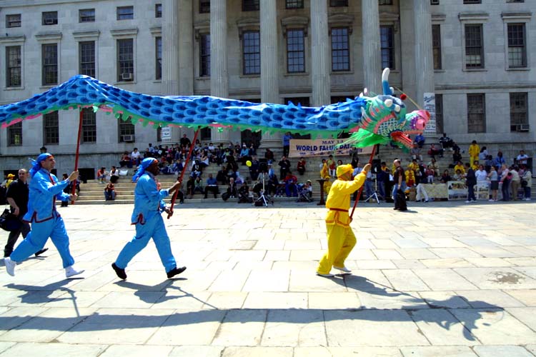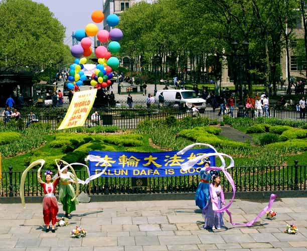 色彩缤纷的庆祝表演把节日的气氛推向了高潮,赢得了阵阵掌声。腰鼓队英姿飒爽,鼓声铿锵有力,伴随着“法轮大法好”的歌声在广场的上空飘扬;一条彩龙在“喜庆”的音乐声中绕着广场上下飞舞,生龙活虎,最被孩子们喜爱;仙女队美丽大方,彩绸舞动,表达着天上人间普天同庆的美好展望。