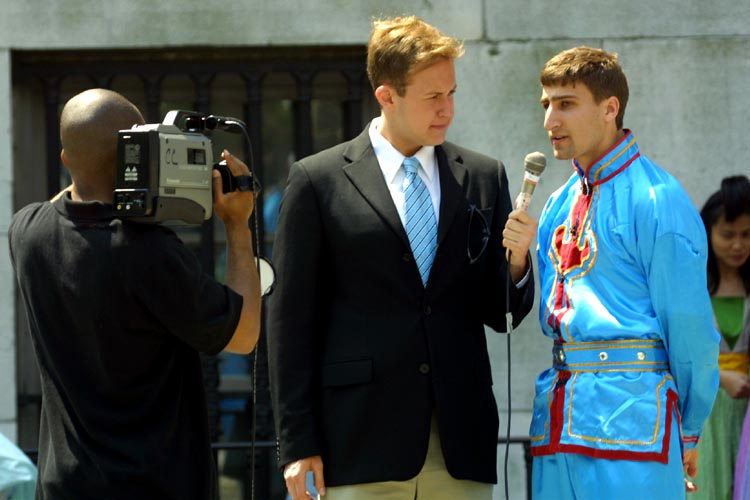 ![]() 媒体采访台湾腰鼓队 | ![]() 媒体采访舞龙队的西人学员 | ![]() 媒体记者学炼法轮功 |
