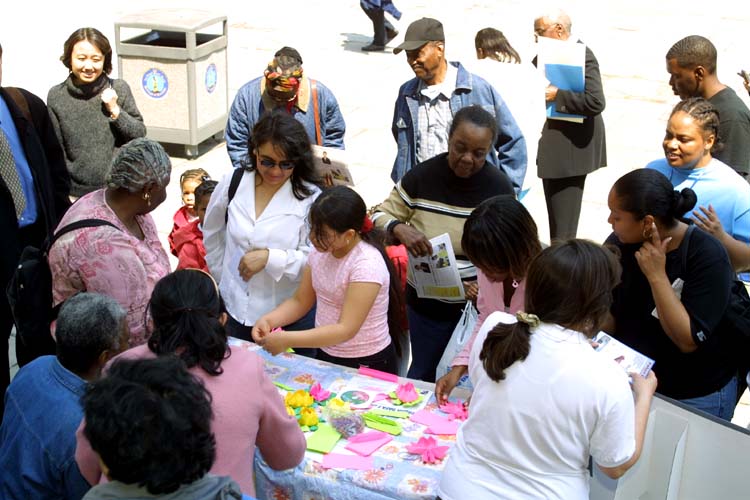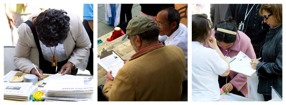 ![]() 孩子们了解法轮功功法、发生在中国的迫害以及“和平的花瓣”活动 | ![]() 行人学做纸莲花 | ![]() 人们在了解真象 |