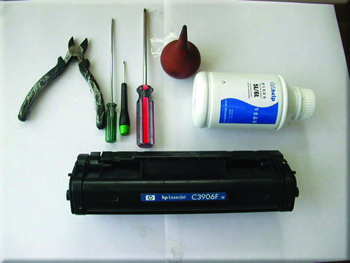 1.准备工作:碳粉一瓶(20元左右)、斜口钳、十字螺丝刀、一字螺丝刀、吹气球(皮老虎)。