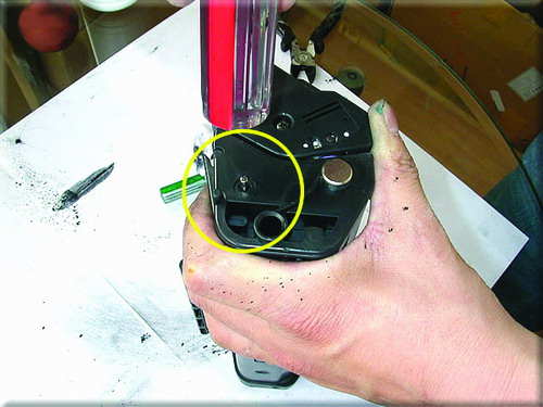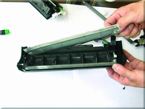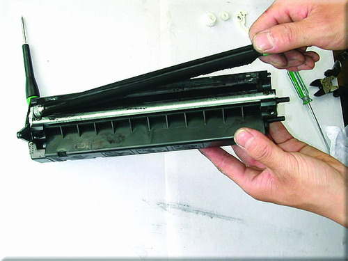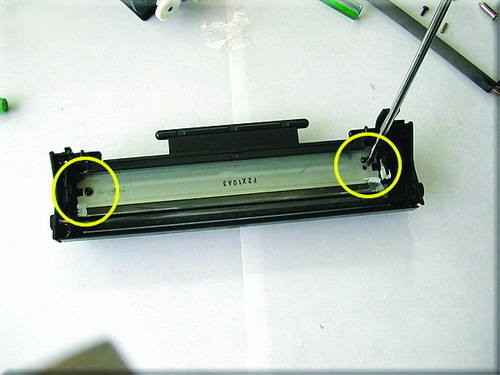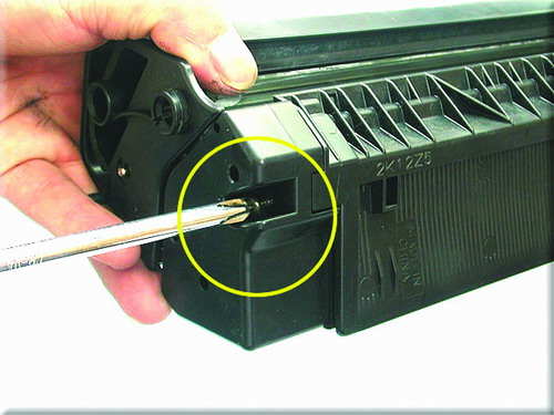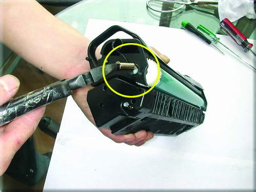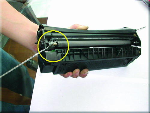 小提示:其它方法是在外面向内打进小铁销,这样也可以,但是很容易对硒鼓造成伤害,运用图中的方法可以很轻松地取出铁销而对硒鼓毫无损伤。
