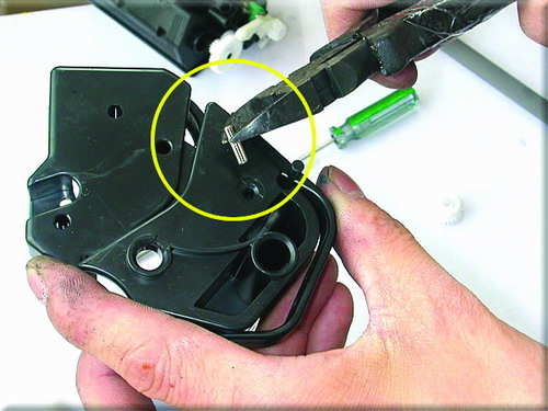 2.左手拿起硒鼓,右手用斜口钳把鼓芯有齿轮一头的定位销拔出。