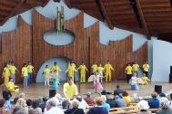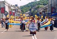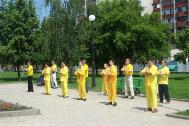 ![]() 29日在公园集体炼功 | ![]() 在市中心的广场表演功法和舞蹈 |