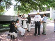 5月27日在参加完芝加哥的大型活动之后,德州“支持诉江汽车之旅”的学员们踏上了返回的路程。为了更深入、更广泛的揭露江氏流氓集团迫害法轮功的残暴行径,学员们又在路易斯安那州的海滨城市新奥尔良(New Orleans)和首府巴特鲁日(Baton Rouge)的市政府前再次演示了恶警酷刑折磨法轮功学员的情景。新奥尔良是个人口40万的中型城市,市政府外更是人来人往、车水马龙,有政府工作人员、警察、过往行人等等,都有机会看到了正在中国发生的暴行,学员们一边发资料,一边解答他们的问题。