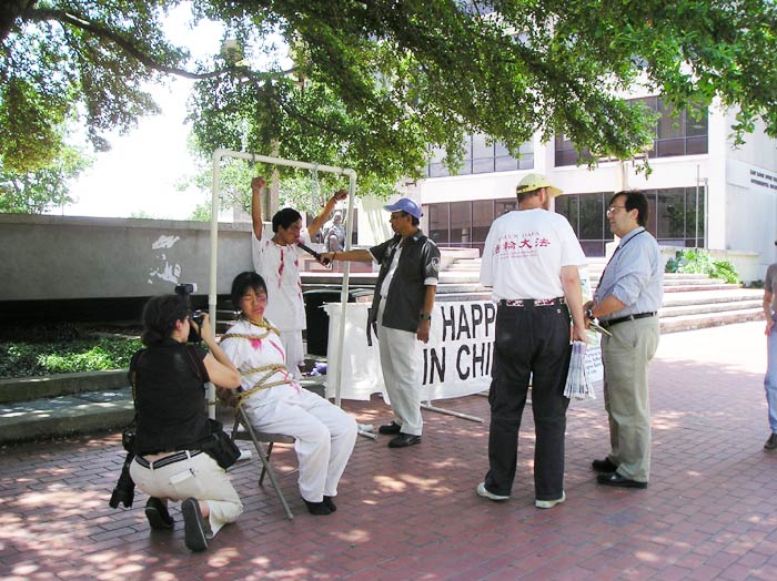 5月28日下午,学员们再次在路易斯安那州首府巴特鲁日的市政府前進行了用酷刑演示讲真象的活动。该市的主要英文报纸“提倡者报”(The Advocate)的两名记者得知消息后赶来采访。其中一位记者拍了许多恶警酷刑折磨法轮功学员的照片,足足拍了一个小时。一位西人学员回答了记者的许多问题。