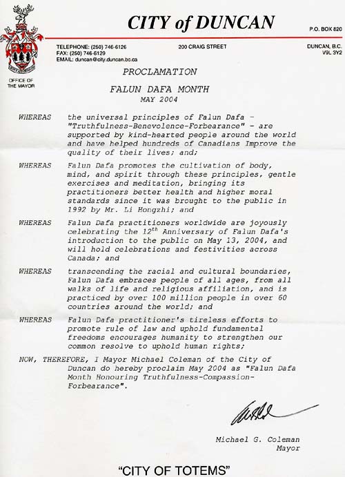 鉴于,全世界法轮大法学员将于2004年5月13日欢庆法轮大法洪传12周年,并在全加拿大举行庆祝活动;并且