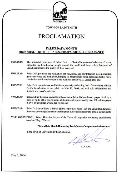 鉴于,全世界法轮大法学员将于2004年5月13日欢庆法轮大法洪传12周年,并在全加拿大举行庆祝活动;并且