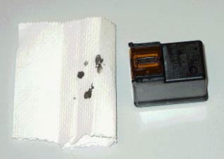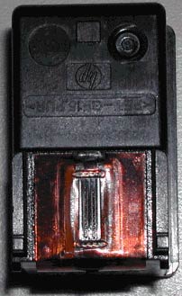 首先将打印机中的墨盒拆下;拆下墨盒后,观察一下墨盒,会发现墨盒底部有类似集成电路的部分(如下图),这就是喷嘴所在的地方,我们的清洁过程就始终围绕着喷嘴所在的这部分: