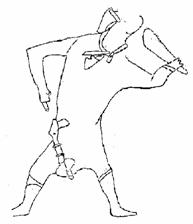 罗夫解读了一个在拉马什发现的蚀刻着图形的石板,他原先认为是一个一边跳着舞一边演奏的小提琴表演家。然而这个小提琴表演家的大腿上似乎系着一支类似枪的东西。14000年前的原始石板画上怎么会有枪呢?真是令人难以理解。然而我们将图片放大,仔细看看图片2,3,他大腿上的确系了一支枪。