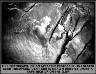 美国犹他州发现了印地安神话传说中的“雷鸟”(thunder bird)壁画。这种雷鸟通常也被视为神话中的生物。然而,在这壁画附近找到了一种名为Pterosaur的恐龙化石,外型与雷鸟十分神似。由这些化石的发现,可见传说或神话中的生物并不像现代人想的仅是虚幻的存在,而有其真实性。