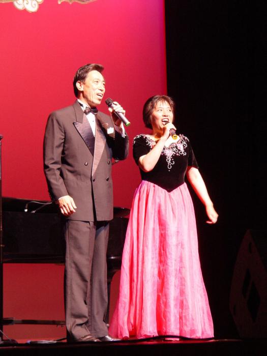 他纯正的音色,嘹亮的歌声赢得了全场的热烈的掌声。人们感叹岁月没有对他的歌声产生任何影响,反而让人觉得他唱的更好了。他告诉观众这一切应该感谢法轮大法。多年前,他的身体非常的虚弱,经常以药来维持,许多音乐界的人士都知道。后经人介绍他修炼了法轮功,什么病都没有了,精力充沛,现在六十岁了还活跃在舞台上。所以希望朋友们不要相信江氏集团那些对法轮功的诬蔑、不实之词,最后他与夫人一起为观众们演唱了他自己创作的歌曲“法轮大法好!”