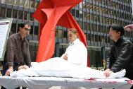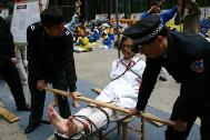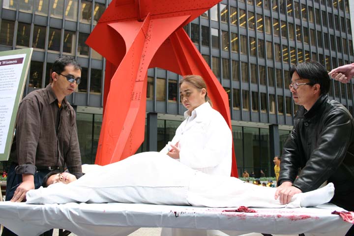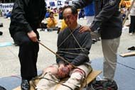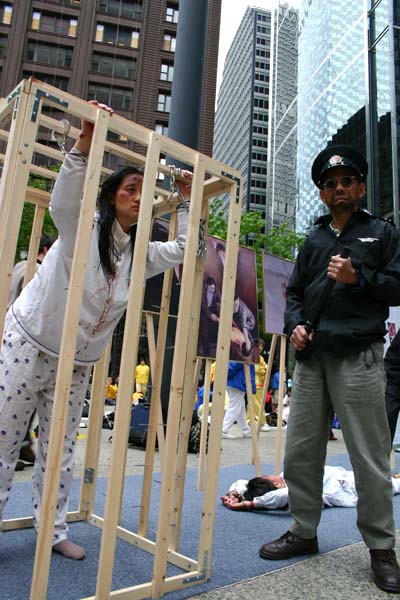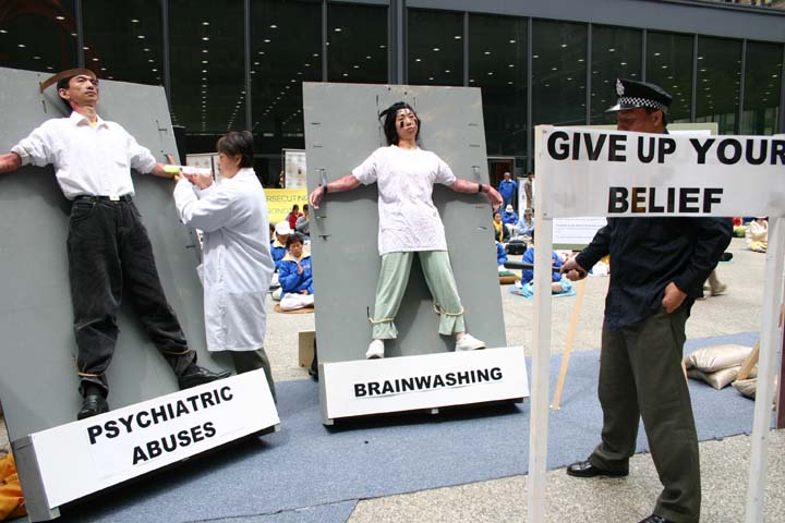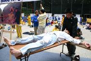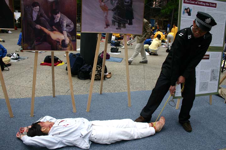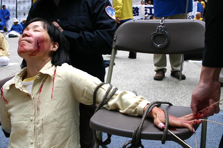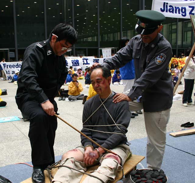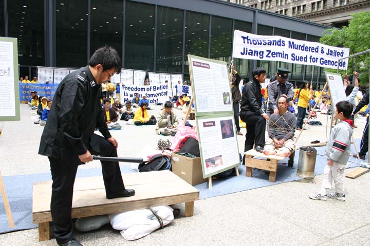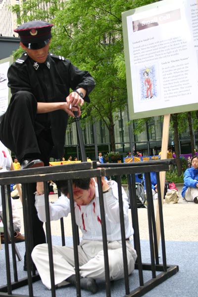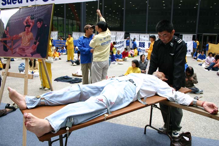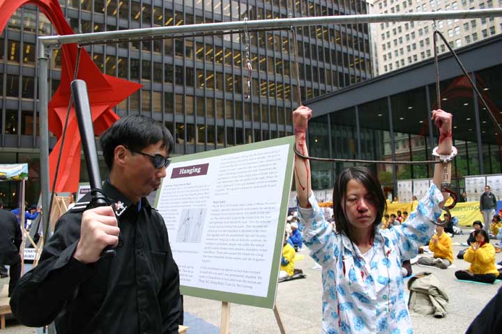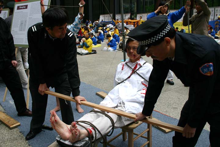 为了让更多的人们能够直观的感受到迫害的残酷,法轮功学员们近期采用以真人演示、模型演示、绘画描述等形式,演示了法轮功学员所受到的部份酷刑。