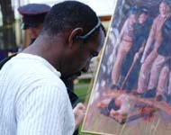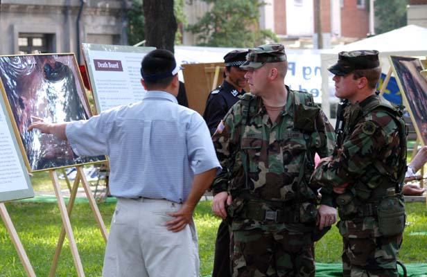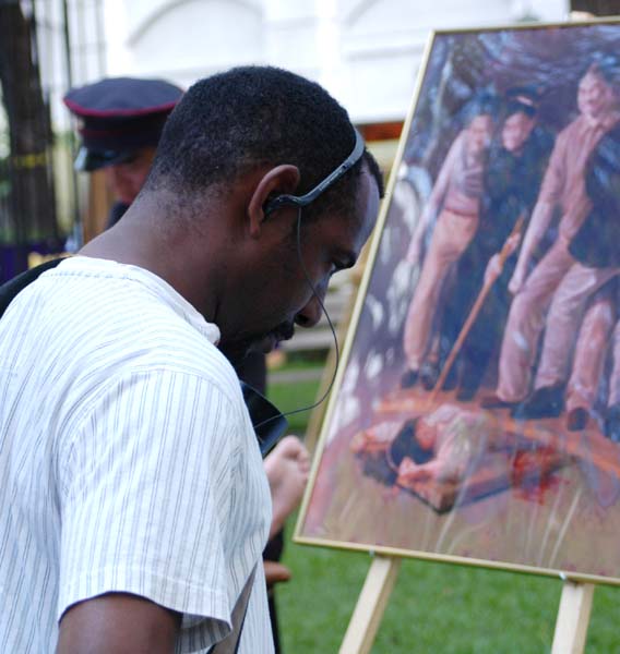 6、市政府的保卫人员萨姆斯带着家人来看酷刑展,当看到布什总统乘坐的直升飞机从头顶飞过时,萨姆斯对法轮功学员说:布什总统应该来看看这个展览,他应该知道中国正在发生的事情。萨姆斯还多次热切地表示要来学练法轮功。