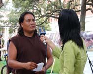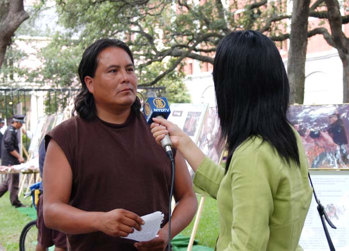 8、来自亚利桑纳州的印地安酋长戴瑞尔-塔理曼在长凳上坐了5个小时观看着酷刑。听着悠扬的音乐,他对法轮功学员说,“我代表全美国的印第安族人,和亚利桑纳州纳瓦合部落的人们,还有天空、太阳、月亮和星星,一起见证这场人类历史上最邪恶的迫害。在神性的世界上,我们生活在大地母亲的怀抱中,和平共生。这场迫害给我的心带来心痛和悲伤,但愿伟大的神性与你和你的国家同在,一起结束这场迫害,让我们重新走上美丽的归途。”