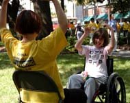 ![]() 印第安酋长接受采访 | ![]() 警察队长的夫人(左起第二位)亲手制作蛋糕送给法轮功学员 | ![]() 学功 |