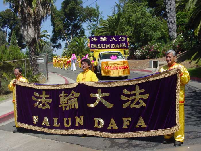 走在法轮功队伍最前方的三名学员举着由中英文书写的“法轮大法”大型横幅,然后是精心装点的花车。花车两侧写着“法轮大法好”和“世界需要真善忍”,花车后面是大法网站的网址,车身前方两侧贴有免费教授法轮功的海报。花车上的学员在游行过程中不间断地演炼着五套优美舒展的法轮功功法。紧随花车之后的是由六名穿着中国传统服饰的女学员组成的舞蹈队,他们在大法音乐的伴奏下翩翩起舞,高贵优雅。最后是由10多名学员组成的腰鼓队。法轮功队伍在整个游行中既壮观又祥和,学员们用不同的方式向世人展示大法的美好。