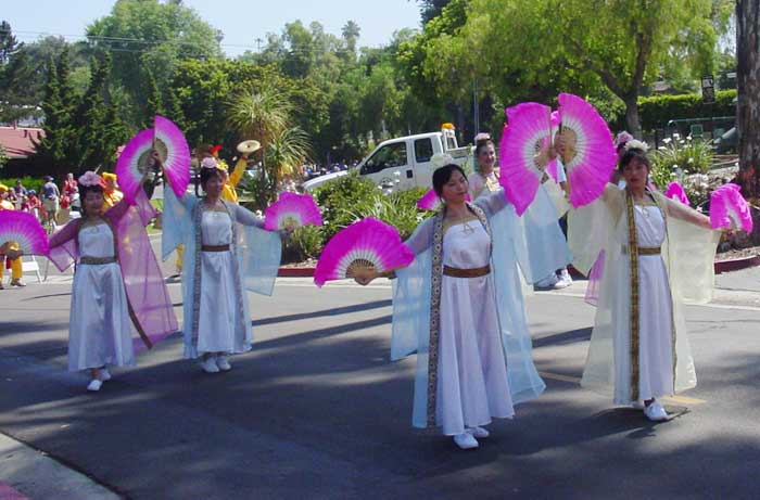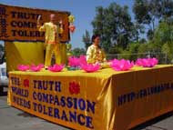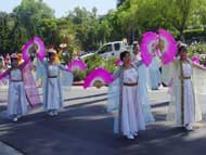 ![]() 法轮功学员的队伍整装待发 | ![]() 花车 | ![]() 扇子舞 |