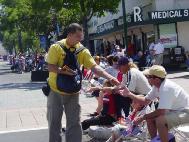 当法轮功队伍走到主席台前时,拉密沙市市长阿特-马德帝(Art Madrid)先生和市议员不停地向学员挥手致意,并用相机照下了法轮功队伍经过时的场面。